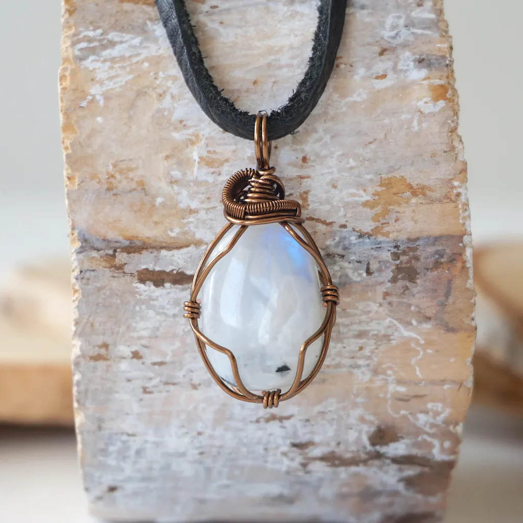 Grounded in natural beauty and shaped by intention, this Men’s Rainbow Moonstone Necklace pairs bold, earthy metalwork with the quiet light of the stone itself. Each pendant features a natural, polished-raw rainbow moonstone (60–75 carats) wrapped by hand in antique bronze finish over copper wire (nickel-free)—a warm, rugged finish designed to feel substantial, timeless, and easy to wear.